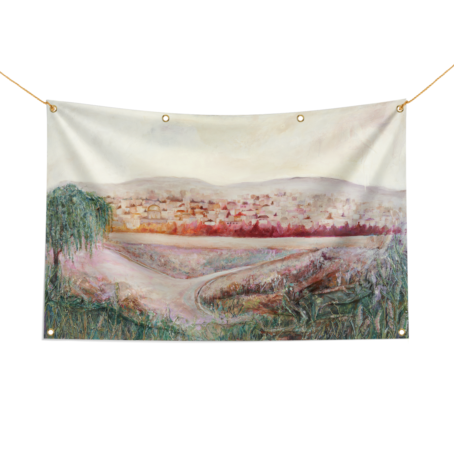 This tapestry captures the essence of Jerusalem with serene blue tones in the foreground, leading the eye along a winding path to a sky glowing with radiant orange hues. It brings the spirit of the city to life, offering a warm and meaningful connection to Jerusalem for your sukkah.